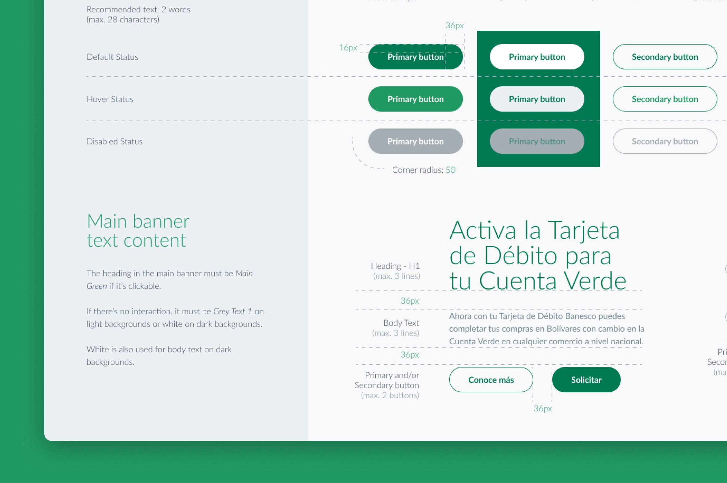 Se creó una guía de estilos con los lineamientos e instrucciones para el correcto uso de logos, colores, tipografía y componentes con sus distintos estados, detallando tamaños y espaciado, padding y márgenes.