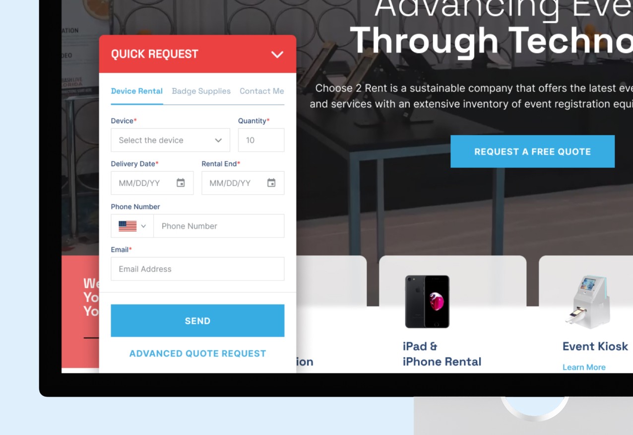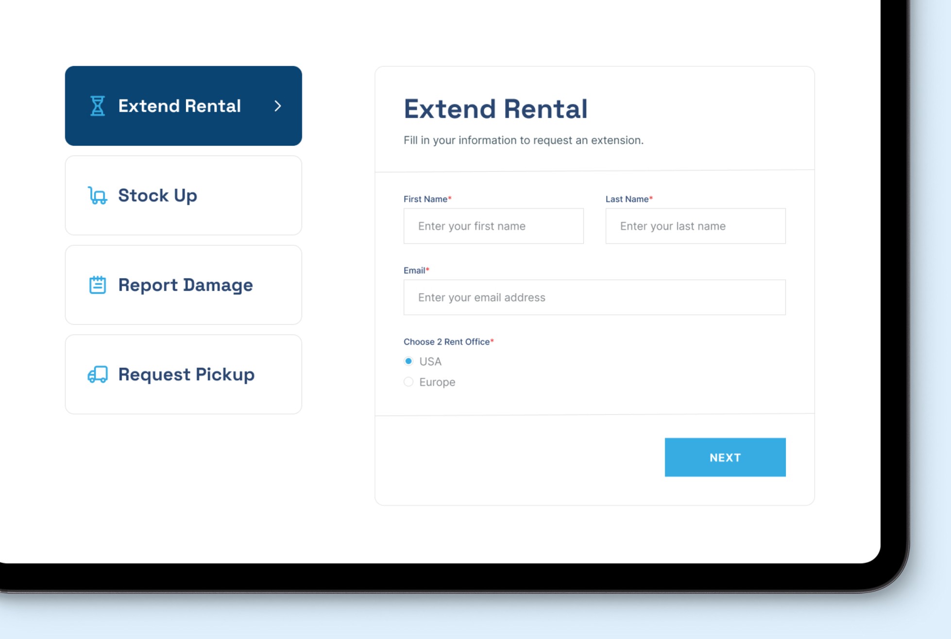 Se trabajó en una página específica para organizar los formularios para los clientes con un alquiler en curso y deseen extender el período de alquiler, pedir más dispositivos, reportar daños o solicitar la recogida de los productos alquilados.